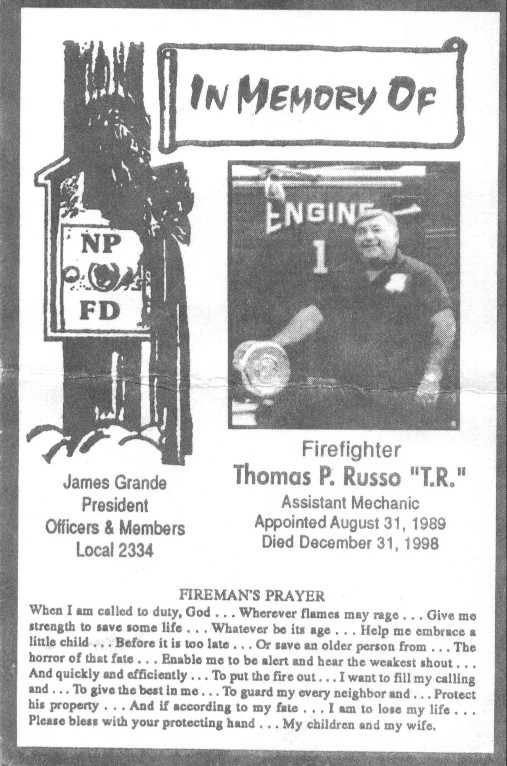 He was rough around the edges, had an earthy sense of humor ('Ralph Kramden'?), a real bark and growl when he spoke, never afraid to say what he thought, but there was a silent layer of compassion beneath it all. He never failed to entertain us with stories, jokes and other antics around the station. TR was a driver for a local company that transported the U.S. Mail, until August of 1989 when he was appointed to the career force at the end of the call system days. Serving as assistant mechanic, he drew upon his years of experience as a trucker and ardent lover of all things automotive. Many will remember how he cared for his own personal vehicles, constantly detailing them, using a floor mat on top of floor mat, so that the car was in showroom condition when traded in. That same passion and concern carried over to the fire apparatus. Once, he was teaching a new driver how to handle Engine 1 and its 5-speed manual transmission. After a session of stalling, grinding gears and missed shifts, the truck was backed safely into its bay and shut down. TR turned to the driver and said, "You know, some people got it and some people ain't; and you ain't got it. I ain't never riding with you in this truck again!" He hopped down from the cab, slammed the door and stalked away.